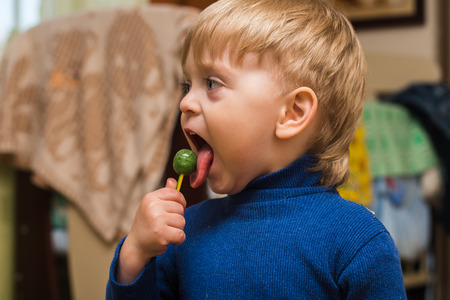 boy 3 years eating candy on a stick at home