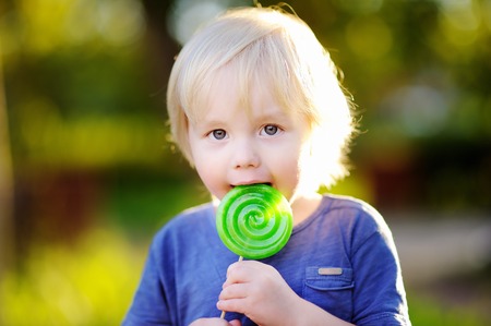 Cute toddler boy with big green lollipop. Child eating sweet candy bar. Sweets for young kids. Summer outdoor fun