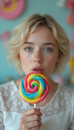 A beautiful young woman with short, tousled blonde hair gazes thoughtfully at the camera while holding a vibrant, swirled lollipop. The playful colors of the candy contrast with her soft features, evoking a sense of nostalgia and joy reminiscent of childhood delights.