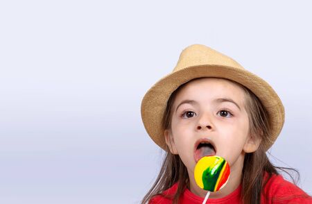 Portrait of little girl eating a colorful lollipop on studio.