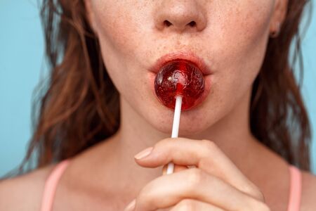 Summer Freestyle. Young woman with freckles standing isolated on blue licking lollipop close-up looking camera curious