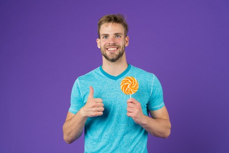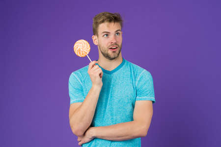 Cheat meal concept. Sugar harmful for health. Guy hold lollipop candy violet background. Man handsome macho eat big colorful sweet lollipop. Taste of childhood. Man with bristle likes lollipop