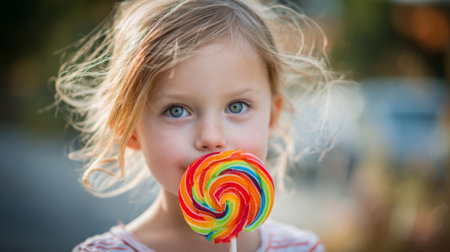 A charming close-up of a young girl with striking blue eyes enjoying a colorful lollipop. Her playful expression captures the essence of childhood joy and innocence.
