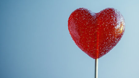 A stunning heart-shaped lollipop is shown with delicate bubbles, reflecting light against a soft blue background, symbolizing sweetness and joy in life.
