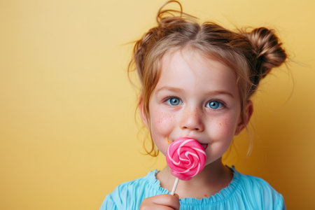 little girl eating lollipop candy on yellow background