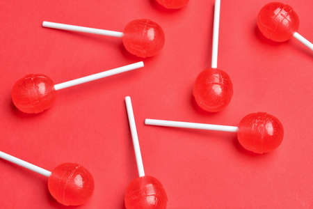 Colorful Candy Conversation Hearts for Valentine's Day. Gum love is, lollipops in the shape of a heart on red background