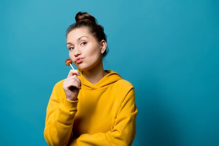 cute girl in a sweatshirt posing holding a lollipop in hand