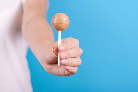Hand with sweet caramel lollipop.