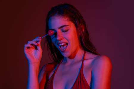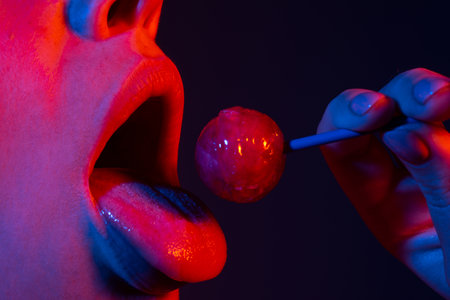 Glamor mouth licking yummy lollypop with red lips. Sucks lolli pop. Sexy female lip. Sensual woman red lips with a Lollipop. Candy bar on neon lights concept.