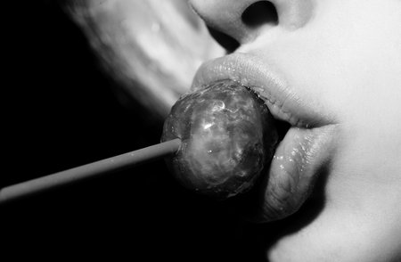 Close up lips with lollipop isolated, sexy blowjob, sensual mouth with lipstick eats sweets. Sexy design for women and girls. Beauty lips.