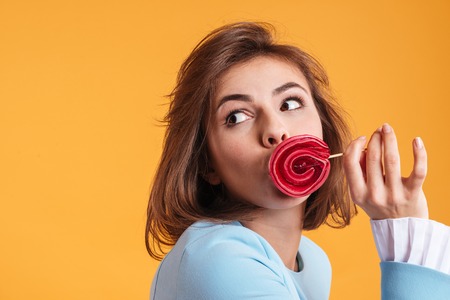 Funny amusing young woman covered her lips with lollipop over yellow background