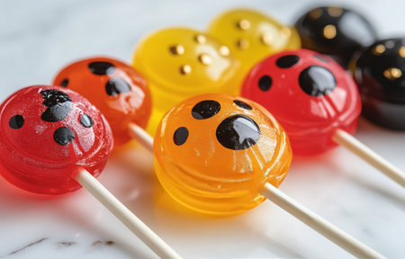 A row of vibrant lollipops shaped like ladybugs showcases playful colors and glittery accents. The treats are set against a bright background, reflecting a cheerful mood perfect for children.