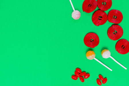 lollipops and red spirals on green background. pattern and series. wallpaper to use text.