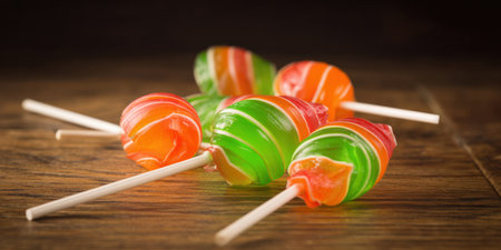 Colorful striped lollipops scattered on a rustic wooden table, evoking childhood treats, sweet cravings and celebratory indulgence with vibrant spirals and warm texture