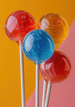 Dynamic shot of lollipops seemingly suspended in mid-air, bright and bold colors.