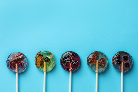 sweet yummy festive colorful lollipops on light blue background. copy space for text. minimalism style