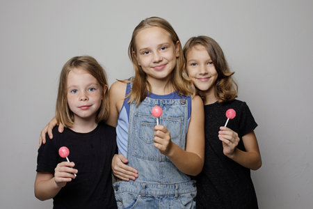 Cheerful excited children eating sweet lollipop candy on white studio wall banner background, fashion portrait