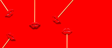Creative pattern with with lips on stick. Valentine day concept or World Kiss Day. Festive red background. Flat lay, copy space.