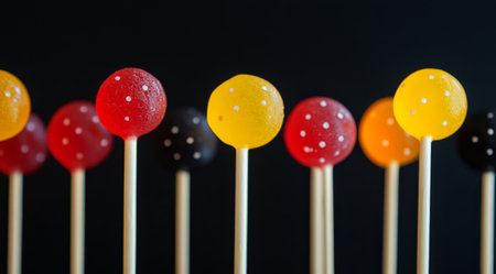 Bright red, yellow, and black lollipops with glossy finishes are arranged in a captivating pattern against a dark background. The display is eye-catching and playful.