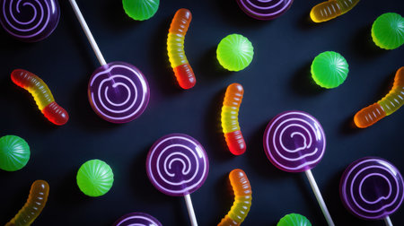 A flat lay arrangement of colorful Halloween candies including gummy worms and purple swirl lollipops on a dark background.