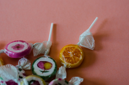 Colorful fruit lollipops on a pink background, unhealthy but delicious snack for children, sweets