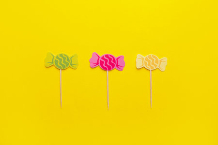 Various sweets assortment. Candy and lollipops on yellow background. Top view flat lay with copy space
