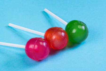 Lollipops on a stick, at the pastel blue background sweets.
