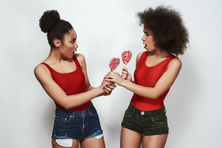 I want more! Two angry afro american woman in jeans shorts are looking at each other with opened mouth and holding lollipops shaped heart