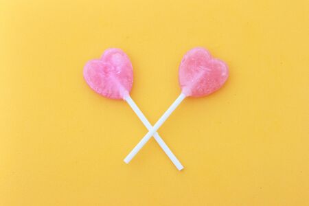 Overhead close-up view of scattered lollipops against yellow background. unaltered, unhealthy eating and sweet food concept.