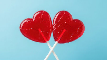 Two glossy red heart-shaped lollipops with swirling patterns are crossed on white sticks against a solid light blue background.