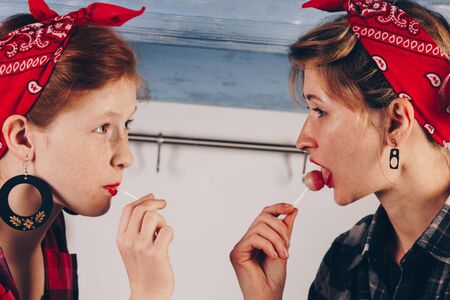 Young women licking sucking red lollipops and smiling . Portrait of two beautiful happy female girl friends . Urban city lifestyle