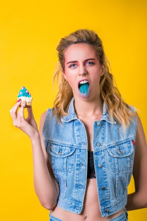 Crazy girl shows her tongue. Fashion makeup and hairstyle. Facial expression, emotion, beauty and fashion concept. Denim fashion. Sexy girl with cupcake isolated on yellow. Funky girl tastes cupcake