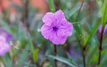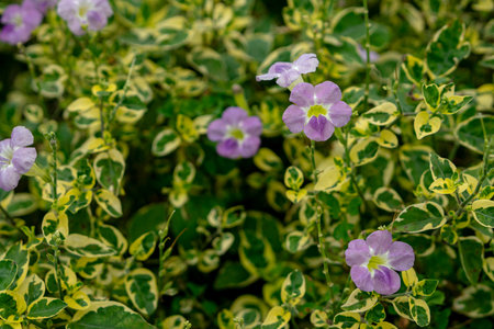 Purple Asystasia gangetica flowers blooming among green-yellow variegated leaves. Vivid close-up in natural light, ideal for floral-themed backgrounds and botanical design assets.