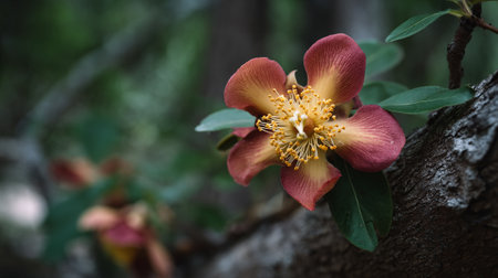 Close-up shot of flower with reddish-brown petals fading to yellow at the center, contrasting with greenery and textured bark in soft focus.