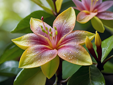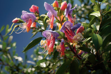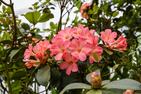 Vireya rhododendrons in bloom, tropical ornamental plants from southeastern Asia, part of the Ericaceae family, growing in lush natural surroundings
