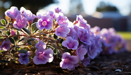 Close-up of delicate purple-pink flowers blooming on a green plant, bathed in natural light with a soft bokeh background. Ideal for spring, garden, and nature themes.