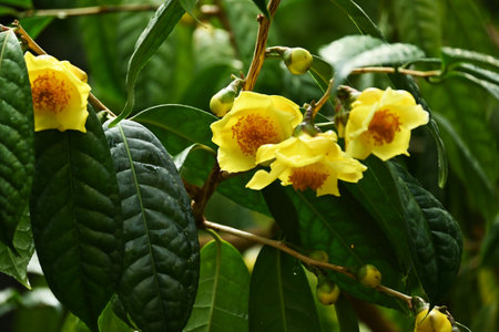 Yellow camellia ( Camellia chrysantha ) flowers. Theaceae evergreen shrub native to China and Vietnam.