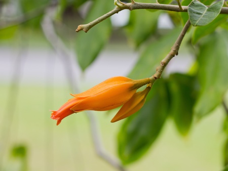 Flamevine orange flowers wall. Green leaves and bright blossoms background
