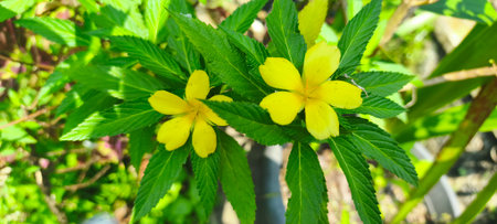 Yellow flowers and green leaves in the garden. Natural floral background.