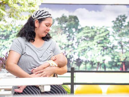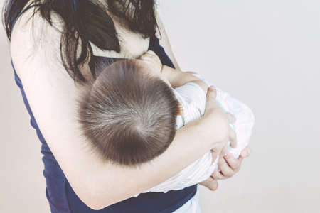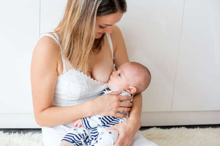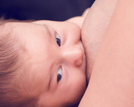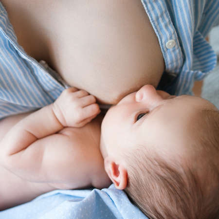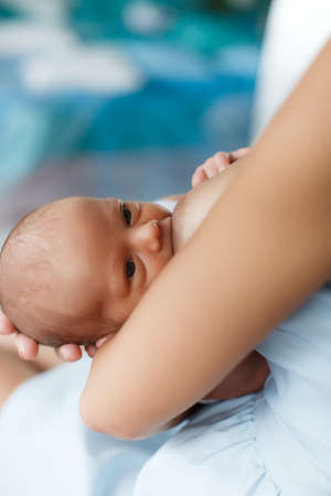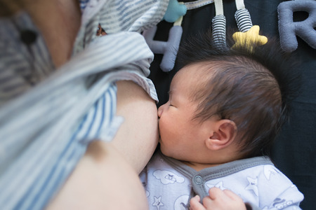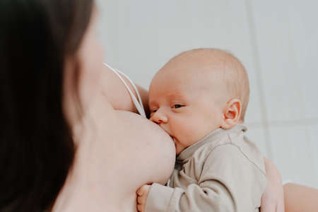 Mother breastfeeding her newborn baby boy, breast milk.