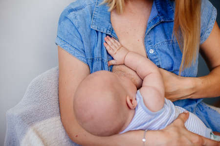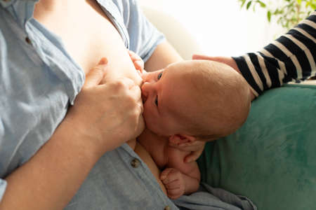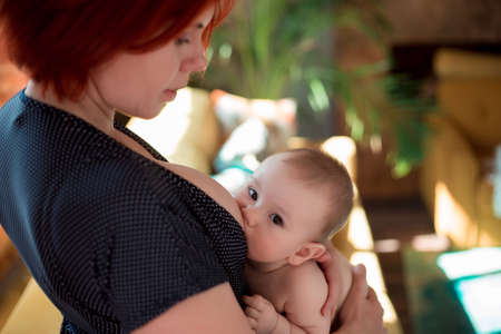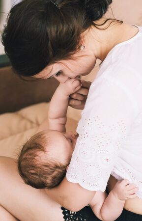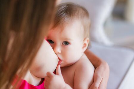 Mother feeding baby at home. Breastfeeding mother with little child. Young woman nursing and feeding baby. Concept of lactation infant.