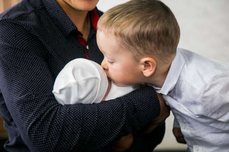 Young dad with newborn daughter and eldest son