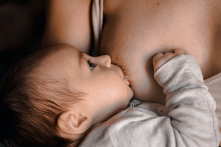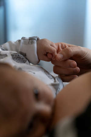 Close-up of a loving caring mother breastfeeding her baby boy. View from above