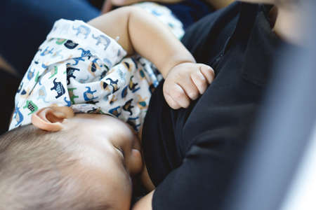 A year old Asian baby Breastfeeding by his mother