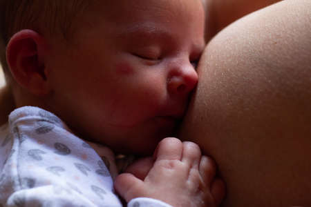 Close-up portrait of a newborn baby sucking a mother's breast. Natural feeding for babies. Baby care. Healthcare.