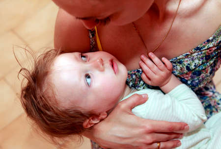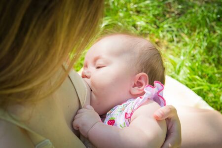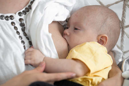 Breastfeeding of little beautiful infant baby by his mother