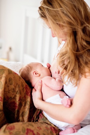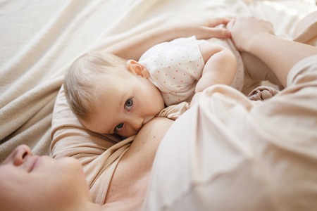 Mother breastfeeding her newborn child on the bedroom.