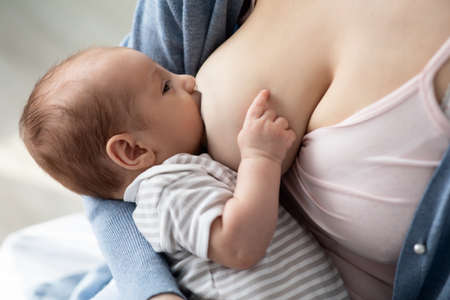 Closeup shot of cute peaceful newborn 0-6 suck mommy milk. Loving mother cuddling her baby, soothing, enjoy breastfeeding moment, feel unconditional love, gives to neonate warmth and natural nutrition