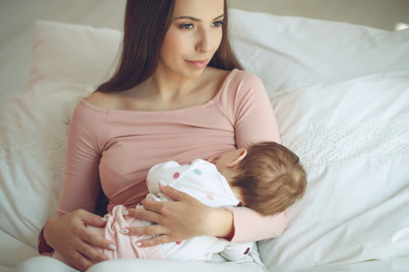 Beautiful woman breastfeeding her baby in a cozy house on the bed.
