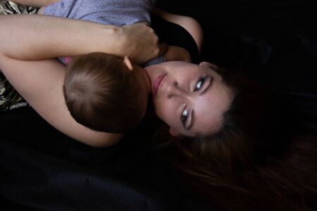 mom lie in bed with baby. the happiness of motherhood. breastfeeding.